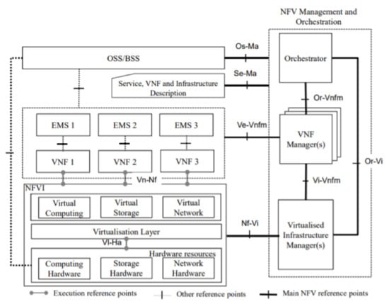 In NFV, the intelligence is provided by the NFV Management and Orchestration (MANO) block. MANO performs all the actions that involve the life cycle management (e.g., creation, configuration, and termination) of the aforementioned VNFs. Furthermore, a Network Service (NS) can encompass multiple VNFs providing a broader service on the whole. MANO can be subdivided into the Virtualized Infrastructure Manager (VIM), and a higher level NFV Orchestrator (NFVO). The VIM is responsible for the interaction with the NFVI resources across one domain during VNF allocation and deallocation tasks, whereas the NFVO works at the level of NSs and VNFs, managing their life cycle.