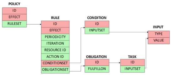 The use of the aforementioned expressive security policies requires the definition of a proper policy language. The policy language defined for Hidra consists of different structs, some optional and some mandatory, enabling the reduction of the policy length when simple policies are needed. These structs go nested one inside another starting from a basic “Policy” struct, as shown in Figure 5, and the order is crucial so that the meaning of the policy does not change. Each defined policy will have at least an identification number and a granting effect for the access request, which can be “permit” or “deny”. This effect prevails in case the policy has no other construct or in case there is any contradiction on them. Apart from that, it is possible to add one or some rules in order to define the different situations that must be evaluated and the related effects.