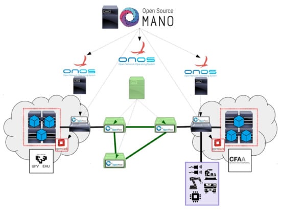 As introduced before, SN4I is an NFV- and SDN-enabled experimental facility deployed across the Faculty of Engineering in Bilbao (EIB) and the Aeronautics Advanced Manufacturing Center (CFAA). These two locations are interconnected through a layer-2 SDN network at a rate of 10 Gbps. Both datacenters are equipped with the hardware and software components that enable the deployment of virtual services in the infrastructure, leveraging NFV technology. The complete infrastructure comprises several SDN switches and servers, amounting to a total computing and storage capacity of around 250 dual-threaded cores, 1 TB of RAM, and 25 TB of storage. Two OpenStack nodes deployed in EIB and the CFAA manage the resources of their respective locations, and three ONOS controllers manage, respectively, the data plane connectivity in the EIB domain, the CFAA domain, and the Wide Area Network between both locations. Finally, an Open Source MANO on top orchestrates the whole NFV and SDN infrastructure. A high-level view of the SN4I infrastructure is shown in Figure 6.