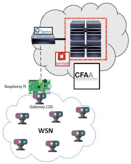 In addition, a WSN has been integrated into this architecture, enabling the deployment of several constrained sensors in the CFAA in order to monitor different environmental parameters such as temperature, humidity, or lightness. The aim of this network is to implement different IIoT applications in the CFAA using Hidra as the access control protocol. Different protocols are used within the WSN, which are suitable for IIoT applications and devices. These protocols are IEEE 802.15.4 [], 6LoWPAN [] and RPL []. The interconnection between the WSN and the wired SN4I is performed through a 6LoWPAN Border Router, which is implemented by means of a Raspberry Pi running the necessary protocol translation and packet routing functions and a CDS connected to the Raspberry Pi in order to allow for the wireless transmission using the IEEE 802.15.4 protocol. The integration between the sensor network and the CFAA plant network is depicted in Figure 7.