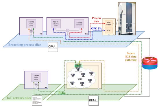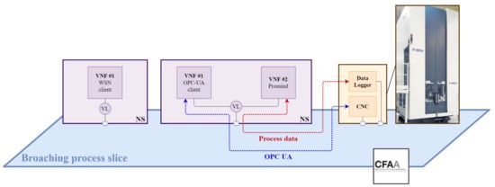 As for the purposes of each VM, one of them is used to support an Open Platform Communications United Architecture (OPC UA) client. Using the OPC UA protocol, it collects parameters of the broaching process exposed by the OPC UA server in the Computer Numerical Control (CNC) of the broaching tool to aid with the monitorization of the process. Meanwhile, the second VM contains Promind software. Promind is fed large amounts of data collected by a data logger installed in the broaching tool, and by the IIoT devices deployed in a separate network slice, in order to predict the behavior of the broaching process and detect possible faults in real-time using ML algorithms.