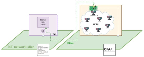 In addition, a second NS containing a single VNF, contains the client responsible for collecting environmental data from the IIoT devices. For this data collection to be carried out securely, the client first authenticates to the Hidra server and obtains the necessary service tickets in order to be entitled to obtain the corresponding data from the deployed CDSs. As already mentioned, the Hidra server and the WSN belong to a different slice, which is covered later in Section 5.3.