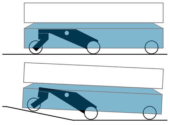 Wheeled mechanisms are the most favorable for mobile robots indoors because of their mechanical simplicity and high efficiency [17,18,19]. Phollower was constructed as a 6-wheel robot (see Figure 1), with the two center wheels powered. These are placed on a rocker arm along with the front and rear supporting wheels. Such a balanced system enables the robot to overcome some uneven or hilly terrain of up to 5 gradient, as shown in Figure 2. Phollower’s built-in balance system consists of the following: