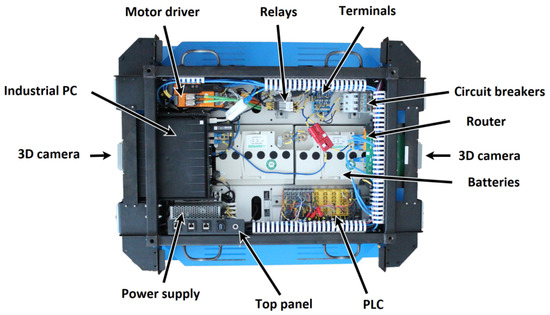 The position of the built-in electrical components was adjusted to the size of the space remaining inside the construction (see Figure 3). Lead-acid batteries are mounted between the parts of the rocker arm balance system. Placing the heavy batteries near the center of gravity improves the stability of the chassis, especially when it is fully loaded. A Programmable Logic Controller (PLC) with integrated programmable safety cards was installed and used to control the drives and also to process the signals. Safety cards evaluate the signals coming from the safety sensors and switch the STO input of the drive inverter, if necessary.