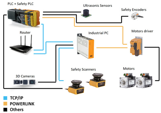 An industrial computer with the Linux operating system was used for calculating and processing the trajectory, as well as for navigation. Fast and reliable communication between the PLC and the industrial computer are provided by the open-Powerlink industrial bus, while openPowerlink Stack is used for the Linux part. The interconnections of all components are shown in Figure 4. This technology was developed in [1] where more detailed information is provided.