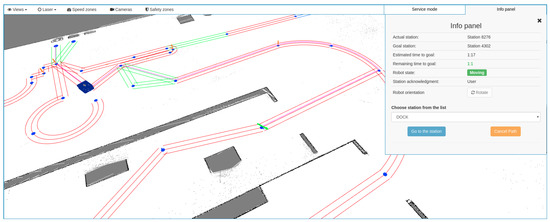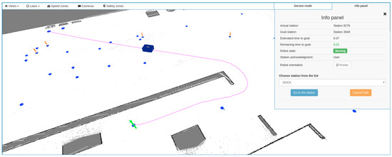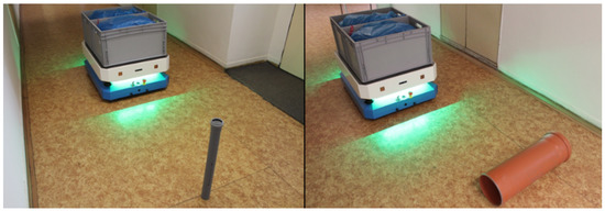 Safety LiDAR operation can be disrupted by a random reflection of shiny objects, such as a glass or mirror. This is detected by Phollower as a “false” safety zone disruption, and it is followed by an immediate stop. These glints are unpredictable, so this routine has been adopted and safety stop is executed every time the glint is detected. There is one more additional 3D camera-based algorithm that detects obstacles above or below the LiDAR scan height range. Used 3D cameras do not have safety certification, but a camera certification is not required by the safety standard. This additional algorithm records a point cloud in front of the robot in the longitudinal direction, and if an obstacle is detected in the point cloud, the robot will decelerate and stop to avoid collision. This protection is applied across the entire width of the robot’s body and detects obstacles 5 cm above the floor.