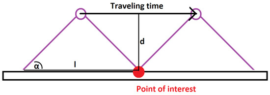 In Figure 13, the red point is a place along the trajectory that needs to be disinfected, purple circles are two germicide tubes, and l is the distance traveled by the robot during which a point to be disinfected is exposed to UVC: