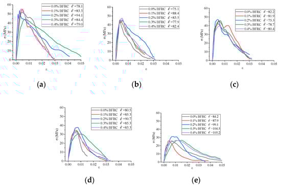 The stress–strain curves of basalt fiber reinforced concrete (BFRC) for different fiber contents and temperatures when the impact velocity is 8.8 m/s. (a) Temperature: 20 °C; (b) temperature: 200 °C; (c) temperature: 400 °C; (d) temperature: 600 °C; and (e) temperature: 800 °C.