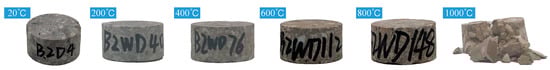 The artificial intelligence box-type resistance furnace (produced by Luoyang Sigma Furnace Industry Co., Ltd., Luoyang, China) was used as heating equipment and the temperatures were controlled by the computer, so the process of heating could be automatic and accurate. The maximum temperature of resistance furnace is 1000 °C. The target temperatures were 20 °C (room temperature), 200 °C, 400 °C, 600 °C, and 800 °C. The heating rate of resistance furnace was set at 10 °C/min [19]. Every target temperature was held constant for 2 h to achieve thermal steady state and also to make sure that the chemical and physical changes of specimens were more thorough.
