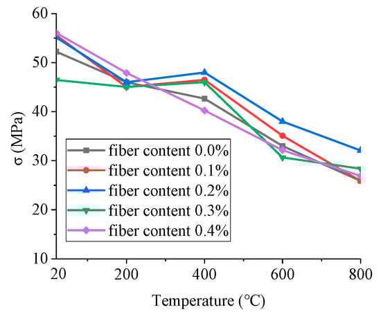 When the impact velocity is 8.8 m/s, the change curves between temperature and dynamic strength of BFRC specimens with different fiber content are shown in Figure 6.