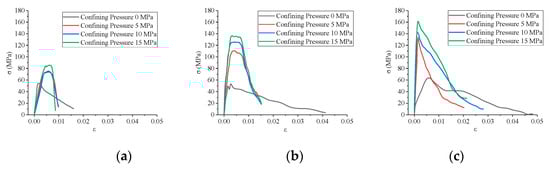 Stress–strain curves of specimens under different impact velocities and confining pressures. (a) Impact velocity: 5.4 m/s; (b) impact velocity: 8.8 m/s; and (c) impact velocity: 11.3 m/s.