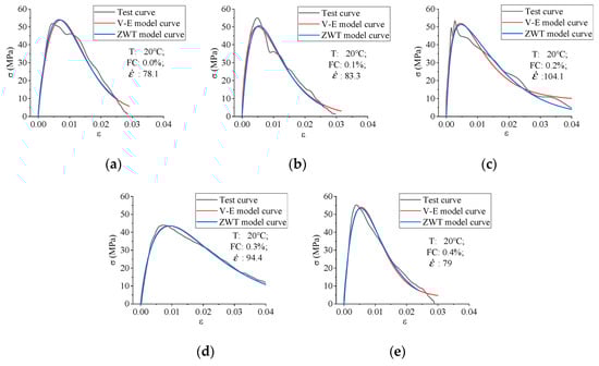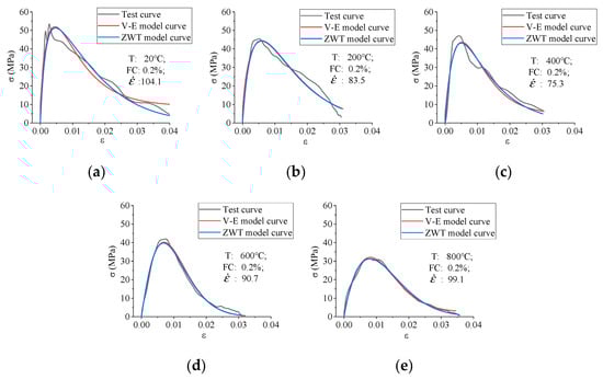 We calculate the stress–strain curves of specimens based on the dynamic statistical damage constitutive model established above, and compare with the test curves. The parameter inversion results were shown in Table 4, and the comparison results of the curves were shown in Figure 10 and Figure 11.