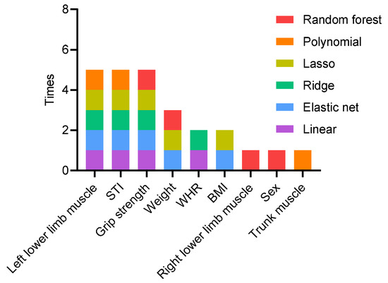 We performed this algorithm separately for the linear regression, random forest, elastic net, polynomial regression, ridge regression, and lasso regression. Depending on the data in the iterations, we analyzed the performance of each model, selected the model with the best prediction effect, and determined the final feature set.