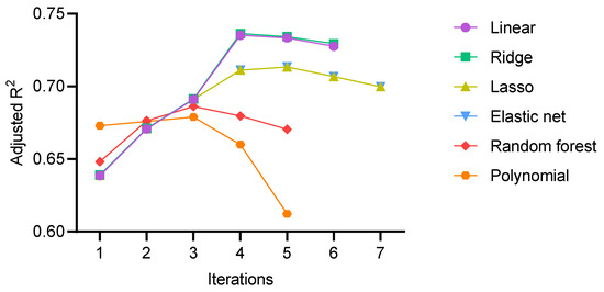 In each iteration, all of the remaining features in the matrix were traversed to obtain the best prediction result. The plot shows how the adjusted R2 of the various models changed as features were iteratively added.