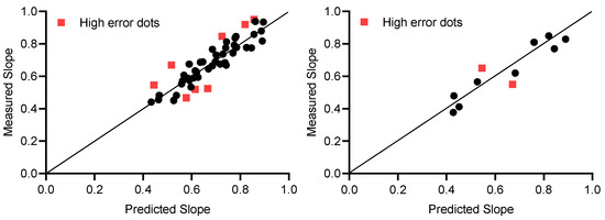 We substituted the test set data into the equation and achieved an adjusted R2 of 0.7068 and a p-value of . Then, relying on the information reflected in the lifestyle questionnaire and the experimental data, we eliminated two cases of large error data. The adjusted R2 value after correction was 0.8247, the p-value was , and the predicted value was significantly correlated with the measured value, which shows that the above formula can predict the slope S of the general population. The scatter plots of the training and test sets are shown in Figure 3.