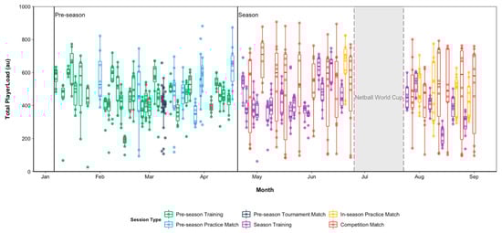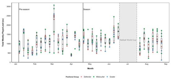 The capacity to monitor the physical movement demands of elite netballers during training and competition in indoor environments has improved in recent years, predominantly due to advances in technology. Wearable devices and local positioning systems (LPS) enable outcomes such as accelerometer-derived load (e.g., PlayerLoad) and more recently, spatiotemporal outcomes (e.g., distances covered) to be collected during training and competition [,]. Currently, there is a scarcity of published data relating to the physical movement demands across the entire netball season, which limits the understanding of the stimuli imposed on these athletes.