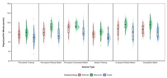 Movement parameters relative to time (intensity) are presented in Table 1. Metreage per minute for all match-play session types (pre-season practice match, in-season practice match, and competition match) was higher than training sessions for all positional groups. Midcourters worked at the highest average running intensity (m∙min−1) in every session type, followed by defenders and then goalers. Similarly, accelerometer-derived movement intensity (PlayerLoad per minute; au∙min−1) showed the same pattern of intensities across session types and positional groups. A visual representation of the movement intensity for each positional group, during each session type (including the distributions), is presented in Figure 3.