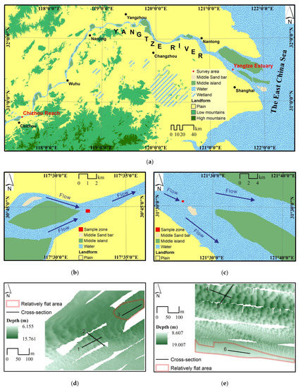(a) Location of the two bathymetric survey areas in Yangtze River, (b) geomorphologic environment surrounding Chizhou Reach, and (c) that of the Yangtze Estuary. (d) Sample data for Chizhou Reach and (e) Yangtze Estuary. Six cross-sections were set in the sample zones and used to compare the water depth profiles with the distribution of mapped geomorphic elements.