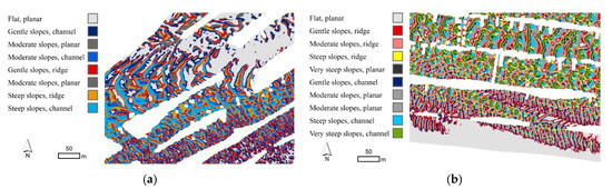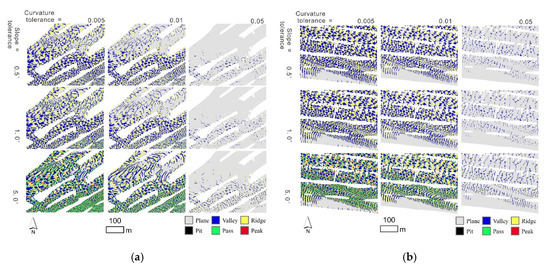 The local range of the surface used to calculate the morphologic parameters is limited to the size of the window. If the size is too small, such as 3 × 3 m, the output will be substantially influenced by meaningless roughness relating to errors; however, if the size is too large, NODATA values will be attributed to more cells near the boundary. Therefore, a reasonable size of traversing window was set as 7 × 7 m in this study. Slope tolerance and curvature tolerance are two key parameters controlling classification. As shown in Figure 2, a larger area is regrouped into plane when the curvature tolerance is larger, while more ridge, pit, and pass can be defined when the slope tolerance is larger. Curvature tolerance should be set within 0.005–0.05, as this can provide an output that is close to eye-based recognition of the relatively flat area.