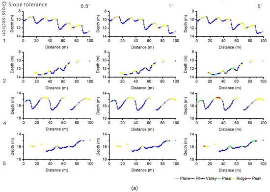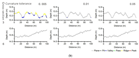 Trough and crest are the main features in dune areas [15,16,17,18]. Using Wood’s criteria, the crest and trough were mainly represented by ridge and valley elements, as shown in Figure 3a. The widths of the ridges and valleys were determined by the curvature tolerance set: large values induced narrow ridges and valley, as shown in Figure 2. Many studies have ascertained that scour pits can be contained in the troughs of bedforms with varying elevations [15,16,17,18], and bedforms contain scour pits with diverse sizes. In the case of Wood’s criteria, the size of the pit element was determined by the curvature and slope tolerance set, as indicated in Table 1. Large slope tolerance with smaller curvature caused larger areas to be defined as scour pits, as shown in Figure 3a, where the scale of pit element was enlarged in both the longitudinal and transverse profiles with a decrease in curvature tolerance. Many studies have identified flat bed as being a typical bedform [9,10,11]. With Wood’s criteria, the element plane was used to indicate a relatively flat, smooth, inclined area, as shown in Figure 3b, and the value of the curvature tolerance determined the distribution of the plane elements. Using Wood’s criteria, a curvature tolerance of 0.01 can be used to filter relatively flat bedforms using plane elements. As evident from Figure 3b, a relatively smaller curvature tolerance should be used to define plane elements on a flat bed.