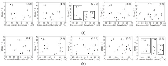 The morphometric parameters calculated under a window size of 7 × 7 m when employing Wood’s criteria were also combined into the input vector to train the SOM. When using the SOM technique, the number of output map units corresponds to the number of geomorphic elements, and the spatial arrangement form of the units can be one-, two-, or three-dimensional. Although the most reasonable number of map units is unknown, Yan et al. [36] found that two and three dimensions offer a more meaningful classification. As a result, arrangement forms including (3 2), (4 2), (2 2 2), (3 3), and (5 2) were considered for arranging the output map units (Figure 4). The mean slope and cross-section curvature for each map unit were calculated as coordinates to plot the units within the feature space. According to a previous study [20], the units should be concentrated in three lines that correspond to three main groups (channel, planar, and ridge) to ensure that the units are well-defined as geomorphic elements. The units can then be sub-defined by slope (such as flat, gentle slope, moderate slope, steep slope, and very steep slope).