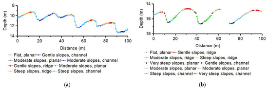 Height, length, and direction of bedforms are important parameters relating to the dynamic features of flow [2]. Although the geomorphic elements map is not suitable for use in calculating these parameters, it provides the potential to narrow the analysis range by separating the dunes area from the relatively flat bedforms. Previous studies have inferred that subaqueous geomorphic elements have statistical relationships with the category of landforms [40,42]. Some studies have found that the spatial distribution of geomorphic elements presents a certain pattern that represents the type of landform [48,49]. As in the relationship between landform elements and landscape, all of the geomorphic elements listed in Figure 9 are meaningful for comprehensively depicting the pattern of elements and regionalizing the bedform areas; however, the development of a more detailed method remains the subject of further research. In addition, the generation of a geomorphic elements map has the great potential to be used in auto-tracking the movement of bedforms, which is significant for assessing bedform instability [50,51].