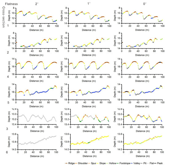 In the case of geomorphons, ridge and valley elements were also used to represent crest and trough bedforms: their scales were determined by flatness, and they increased in accordance with decrements in flatness (Figure 8). Similarly, the size of the pit element was determined by flatness, and smaller degrees of flatness created a greater surface with low roughness into a pit element within troughs of bedforms, as indicated in Figure 8, where the scale of the pit element is enlarged in both the longitudinal and transverse profiles and the decrements in flatness relate to those in cross-sections 1, 2, 4, and 5. Geomorphons use flat element to indicate relatively flat areas under suitable flatness degrees, and a flatness degree of 2° can be used to filter relatively flat bedforms using flat elements. Cross-section 6 in Figure 8 shows that when flatness was 0°, the flat bed could be redefined as a slope element without a ridge and a valley, and Cross-section 3 shows that relatively flat bedforms were redefined as slope elements coupled with a ridge and a valley (Figure 8). It thus seems feasible to use geomorphons to distinguish flat beds from relatively flat bedforms by combining geomorphons-based element maps when flatness is equal to zero and relatively smaller.
