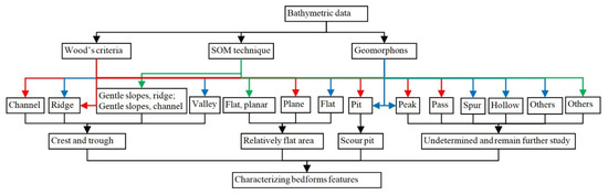 Many studies have focused on extracting the crest and trough of bedforms because height, wavelength, and asymmetry of bedforms provide an indication of the flow velocity and direction [2,3]. In this respect, a bedform tracking tool was developed to automatically detect the locations of crests and troughs from the curves of profiles [4,5,6]. In addition, Van Dijk et al. [7] used a geostatistical filter to generate crest and trough lines as a set of points from the filtered bathymetric surface, and Debese et al. [8] used geodesic morphology to extract the salient crest and trough lines of sand structures in three dimensions. However, for a flow with an increasing strength, many typical bedforms can be formed, such as ripples, dunes, anti-dunes, lower flat beds, and upper flat beds [9,10,11]. Flat beds are also identified as plane beds in some studies [12,13,14]. A flat bed is a widely spreading bedform in a river’s subaqueous environment, and it may not contain many crest and trough features. The complicated development and spatial distribution of the bedform cannot be comprehensively identified using only crest and trough. In addition, scour pits can be contained in troughs with varying elevations with manual inspection, as indicated in many studies [15,16,17,18]. Therefore, a greater detailed geomorphic element layer is required to describe the texture or roughness information of features such as flat and plane beds, and scour pits. Particularly, scour pits have an influence on the stability of underwater structures.
