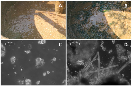 Biofilm deposit in the basins of the cooling tower fed with reverse osmosis (RO) permeate poor in nutrients (A) and the cooling tower fed with RO permeate enriched in nutrients (B) and associated microscopic pictures (C,D) respectively.