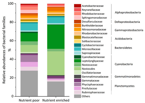 The 16S rRNA gene amplicon sequencing analyses revealed large fractions of Proteobacteria: 32 and 19%, Cyanobacteria: 25 and 57%, and Planctomycetes: 21 and 7% in the nutrient poor and nutrient enriched biofilms respectively. The relative abundances of the main families are shown in Figure 2. Microscillaceae, Leptolyngbyaceae and an undefined Nostocales family were the most represented groups in both samples.