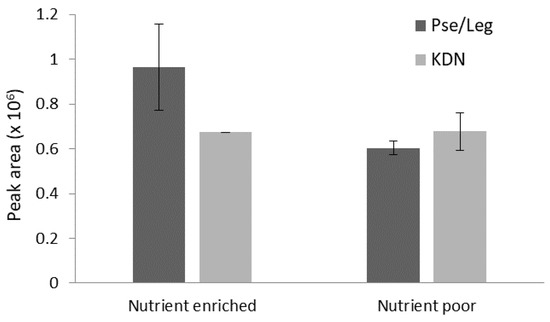 Observed mass spectrometric peak areas of sialic acids in nutrient enriched and nutrient poor biofilm extracellular polymeric substances (EPS). The error bars represent the minimum and maximum values. Abundances of both sialic acids were not significantly different between the samples (p-values > 0.05).