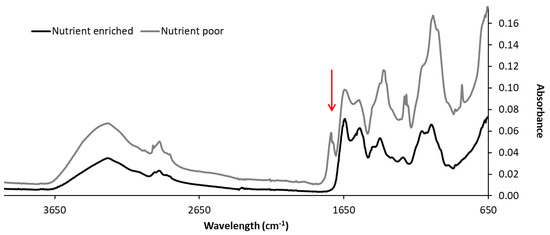 The FTIR analysis shows a sharp peak around 1738 cm−1 and a shoulder peak at 1730 cm−1 in the nutrient poor EPS spectrum, which are absent from the nutrient enriched EPS spectrum (Figure 4). The shoulder peak at 1730 cm−1 has been previously associated to the alpha-keto aldonic acid structure in sialic acids [5]. The presence of this peak in the FTIR analysis of the nutrient poor EPS might indicate additional production of other ulosonic acid variants (e.g., 7 or 8 carbon sugars) at larger quantities potentially induced by nutrient starvation, or increased exposure of the observed nine-carbon sugars. Correlation between FTIR and MS analyses needs to be further investigated.