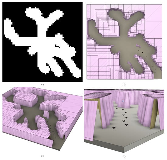 (a) Example of environment obtained by Algorithm 1, representing an area of 15 m × 15 m. (b) 3D visualization of this environment. Several bottom-right walls have been removed to highlight the access point to the environment. (c,d) Example of drone entry process and first steps of deployment behavior.