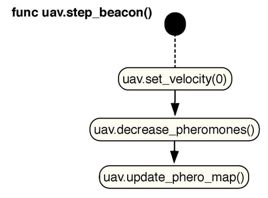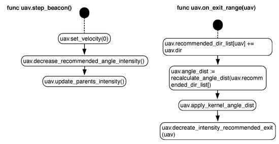 The purpose of the vehicles beacon or repeaters is multiple. On the one hand, given that the behavior guarantees that there will be at least one communication channel between two vehicles, they are in charge of providing a communication platform between the drones. This platform could be useful, for example, in case we want to manually inspect a specific area of the environment where the drones have had access. It will also be used, when calculating the angular recommendation intensity of each beacon, as we will see later. The behavior of these individuals is defined in Figure 5.