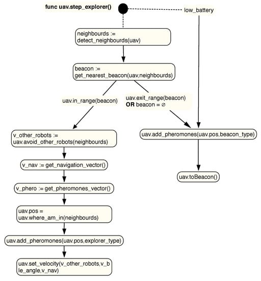 The main purpose of active robots is to explore the environment. Therefore, this behavior has a high energy cost as it requires robots to fly over the environment to develop the deployment behavior. The behavior of these individuals is defined in Figure 4.