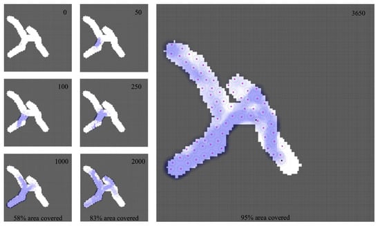 To test the LTID deployment strategy, 50 tests will be developed for different take-off time intervals (6, 8, 10, 12, 18, and 24 s). Each test will have a randomly generated map of the type to be tested, as well as a different starting point. By not considering redeployment, we will assume that we have a sufficient number of individuals to completely cover the environment (given their area of perception, in our case, set to ). In these tests, we will assume an upper limit of 100 individuals, which allows us to cover a maximum area of 1000 m.
