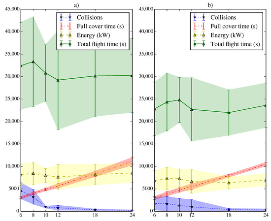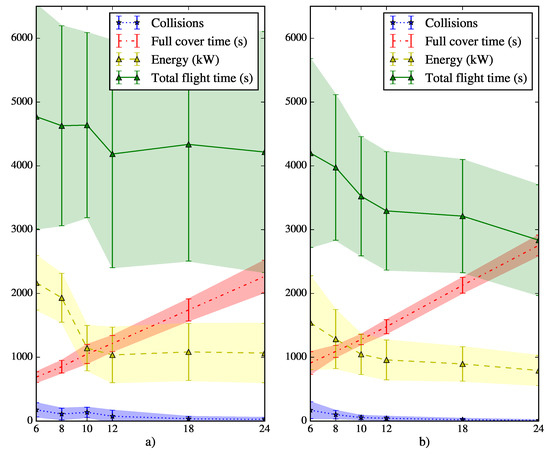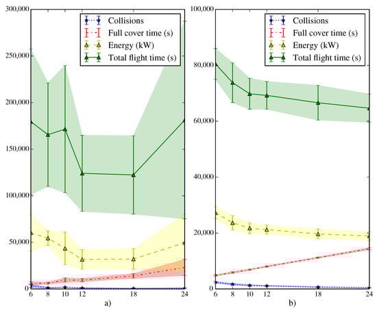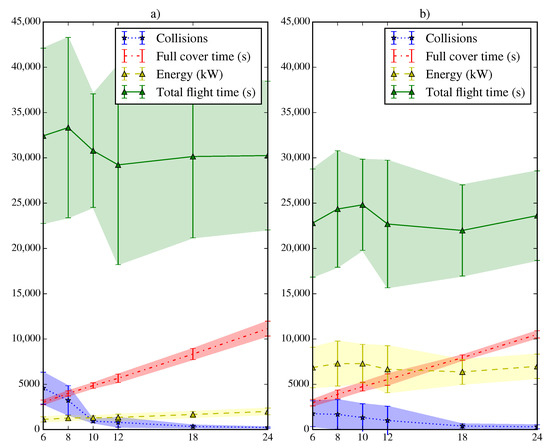 At a general level, it is easy to see how the minimum time required to reach the desired coverage (approximately 16 min) is achieved with a take-off time interval of 6 s (the shortest used). However, the shorter interval also increases the number of collisions between vehicles. The energy required by the swarm starts at 2000 kW for a take-off time interval of 6 s and decreases to 1000 kW as the time interval increases. This decrease is significant for the initial interval and becomes much less pronounced for an interval of 12 s. The same is not true for the deployment time, which increases continuously from the initial 6 s take-off interval (and 16 min deployment) to the 24 s take-off interval (and 30 min deployment) for the SLABE behavior.