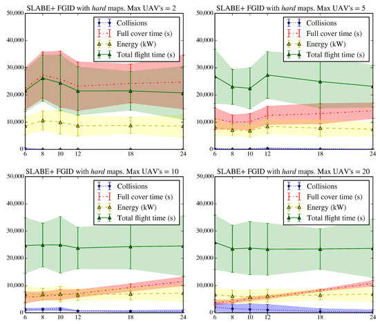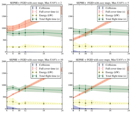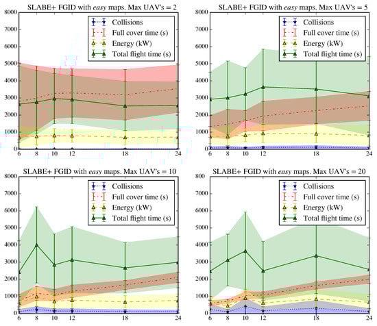 Figure 16 and Figure 17 show the tests performed for the SLABE and SEPHE behaviors, respectively, using the FGID deployment strategy for different take-off time intervals and maximum number of vehicles on easy maps.