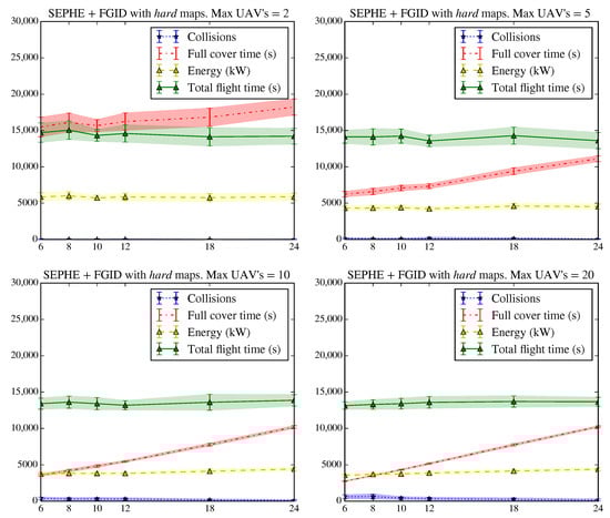 Results of the SEPHE behavior simulations for the FGID take-off strategy in a hard environment. The graph shows the average evolution and variation of the number of collisions, the time required to achieve 95% coverage of the environment, the energy consumed by the swarm, and the total flight time for 600 simulations (50 simulations on the same map for each combination of take-off time interval and maximum number of vehicles in flight).