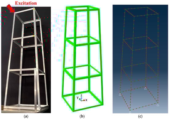 Three-story two-bay experimental frame structure: (a) Physical model, (b) finite-element model with sectional profile rendering, and (c) finite-element mesh with nodes (red dots) and fixed boundary conditions (white triangles).