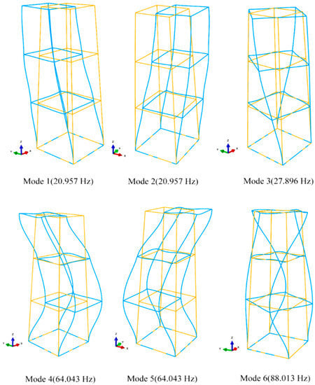 The modal analysis of the finite-element model provided the modal frequencies and corresponding mode shapes. The first 10 modes are listed in Table 4, and the first six mode shapes are illustrated in Figure 5. Due to the symmetry of the model, mode frequencies (1, 2), (4, 5), and (8, 9) were exactly paired, and the mode shapes were the same in horizontal directions. The modal frequencies predicted by FEM are systematically higher than those obtained from the experiment. A possible reason is due to the presence of the bolt joints for the physical model, which is absent for the finite-element model. The presence of bolt joints added additional weight to the structure and also reduced flexural stiffnesses of the structural members, both potentially resulting in lower modal frequencies of the entire structure.