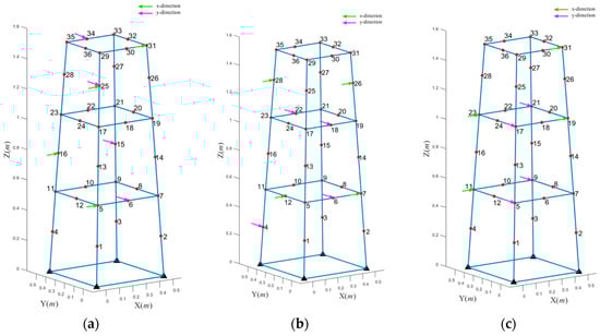 Subsequently, the FEM results were input into OSP algorithms, which output the eight best locations, as listed in Table 5. The sensor positions obtained using three methods are illustrated in Figure 6, where Node 29 is the excitation node, green arrows represent x-direction sensors, and magenta arrows represent y-direction sensors. Node 25 in the MOP method was collocated by two sensors, which were not limited by the MOP algorithm. These sensors were placed on the selected nodes of the physical model according to Table 5, and we performed vibration tests for each selection.