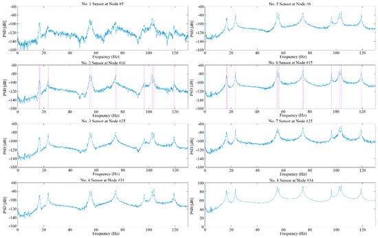 Figure 7 illustrates the acceleration PSDs of each sensor when using the MOP method. This figure spans a frequency range from 0 to 130 Hz, which covers the first 10 modes of the frame structure. Note that the PSD of No. 8 sensor at Node 34 shows the greatest amplitude and cleanest signals among the eight deployed sensors. The primary reason is attributed to the nature of the operational modal analysis method in the present study when performing singular value decomposition for identifying the PSDs. Either the sensor location near the free ends or close to excitation node may also affect the signal amplitudes, but is of secondary importance. Nevertheless, only peak frequencies without the need of signal amplitude of the PSDs are of interest for determining the modal frequencies. The peak frequencies are obtained (See examples indicated by the pink-dashed vertical lines in the PSDs of No. 2 and 6 sensors) and listed in Table 4, and compared with the values predicted using the FEM. The symmetry of modes was also resolved; however, the frequencies were on average 14% lower than those obtained through the FEM. The signals from different sensors did not indicate significant differences in modal frequencies. In terms of the characteristics of frequency response, the modes along the x-direction and the torsional modes were well excited. Distinctive peaks were observed, which proved that rich structural information was included in the measurements at the OSP locations.