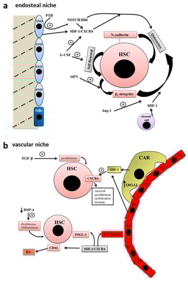The endosteal niche is localized in the internal bone shell surface [30], in particular, close to the endocortical and trabecular surfaces [29], and include two types of osteoblastic cells, the actively bone-producing osteoblasts and a type of early osteoblast termed spindle-shaped N-cadherin+ CD45- osteoblastic cells (SNO) [31]. There is a crosstalk between SNO cells and hematopoietic stem cells (HSCs), which regulate the cycle, the fate and activity of both SNO and HSC [29] (Figure 1a).