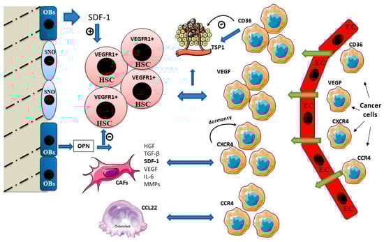 We have previously discussed the crucial role of osteoblasts located in the endosteal niche in the regulation of the activity and fate of HSCs [29]. HSCs which adhere to osteoblasts express angiopoietin receptor-2 (Tie-2), while the lining cells in BM synthesize Ang-1. The activation of Tie-2 by Ang-1 induces the adhesion of the two cell types and Ang-1 enhances the survival of HSCs [37]. In addition, it has been demonstrated that another mesenchymal-derived cell-type resident in the endosteal niche involved in the formation and progression of bone metastasis includes fibroblasts. CAFs form a supportive microenvironment that promotes tumor progression by regulating ECM deposition, recruitment of inflammatory mediators and epithelial differentiation [38,39]. CAFs are one of the most abundant stromal cell types in breast cancer and are associated with poor prognosis [40]. They release numerous factors that include hepatocyte growth factor (HGF), TGF-β, stromal-derived factor 1 (SDF-1), VEGF, interleukin-6 (IL-6), in addition to MMPs that affect several hallmarks of cancer, including tumor growth, invasion, metastasis and therapy resistance [41,42]. Human BM-derived mesenchymal stem cells (MSCs) stimulated with conditioned medium from breast cancer cells can acquire a CAF-like phenotype [43] (Figure 2). SDF-1 signaling seems to be implicated in tumor metastasis tropism. SDF-1 gradients regulate HSC retention within BM niches, and cancer cells expressing SDF-1 receptor (CXCR4) home to bone and reside in the pre-metastatic niche.
