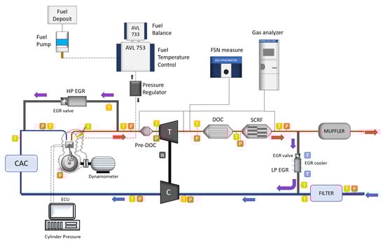 Scheme of the engine (with pre-turbine pre-DOC) and experimental setup.