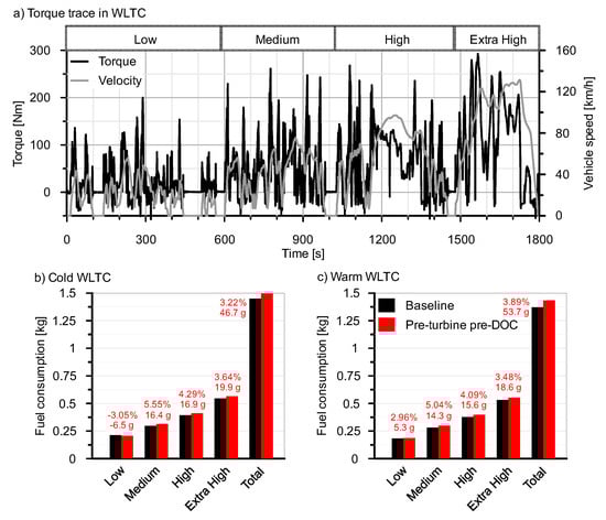 Figure 2a shows the vehicle speed during the WLTC superimposed over the engine torque provided by the engine to reach it. The driving cycle is composed of four speed phases, from low to extra-high speed, which will be taken as reference to conduct the analysis of the results along with the total cumulative result of mass-based magnitudes. With this approach, Figure 2b,c represent the cumulative fuel consumption in every speed phase and the total amount for each ATS configuration in cold and warm WLTCs respectively. The fuel consumption was lower in the warm cycles but the difference between baseline ATS and pre-turbine pre-DOC configurations was similar in all cases. An increase of fuel consumption was brought by the installation of the pre-turbine pre-DOC. The cumulative fuel consumption at the end of the cycle increased in (46.7 g) and (53.7 g) in cold and warm WLTCs respectively. On this regard, the variation in fuel consumption brought by the pre-turbine pre-DOC configuration in every WTLC phase is detailed in Figure 2b,c. In cold conditions, the pre-turbine pre-DOC configuration improved the fuel consumption during the low-speed phase ( (−6.5 g)). However, a progressive deterioration of the fuel consumption was found from the medium speed phase on. In warm cycles, the trend was similar in these medium- to extra-high-speed phases but the low-speed phase also resulted in a fuel consumption penalty for the pre-turbine pre-DOC configuration ( (5.3 g)).