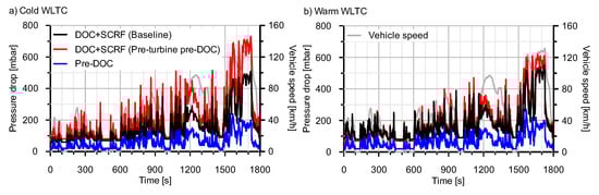 Pressure drop in DOC+SCRF and pre-turbine pre-DOC in (a) cold and (b) warm tests with baseline ATS and pre-turbine pre-DOC configurations.