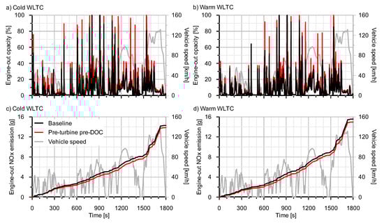 Figure 4a,b show that the higher opacity in pre-turbine pre-DOC configuration with respect to the baseline ATS case is present throughout the cold and warm cycles. The penalty is similar between them during medium-, high- and extra-high-speed phases. In contrast, the pre-turbine pre-DOC case increased more the opacity in cold operation than in warm driving during the low-speed phase. Figure 4c,d depict the cumulative engine-out NOx emission. According to the increase of the internal EGR because of the exhaust manifold pressure increase, the engine-out NOx emissions decreased by the installation of the pre-turbine pre-DOC. At the end of the cycle, the NOx emission reduction reached 0.43 g (3%) in the cold WLCT and 0.60 g (3.9%) in the warm case.
