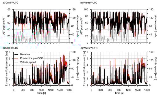 The addition of this pressure drop to the exhaust path penalizes the engine backpressure by itself, but also induces a negative effect on the boost control, as described next. On the one hand, the pre-turbine location directly affects the amplitude of the instantaneous pressure pulses at the turbine inlet. As seen in previous works, this location produces a change from pulsating to constant pressure turbocharging that can have a positive impact on the turbine efficiency [27]. At the same time, the rarefaction wave affects the gas exchange process increasing the internal EGR. On the other hand, these changes in the gas exchange induce an increase in the soot emission, as shown in Figure 4a,b by the instantaneous engine-out opacity and found in previous studies regarding pre-turbine ATS [18]. Consequently, higher SCRF soot loading was obtained, what explains the difference in DOC+SCRF pressure drop between pre-turbine pre-DOC configuration and the baseline ATS observed in Figure 3. Due to the change in the flow pattern at the VGT inlet and, mainly, the increase of the tailpipe backpressure, the engine control varied the VGT position (closing it) to reach the target boost pressure (the HP- and LP-EGR control strategy was unaltered, so no differences in EGR rate were produced). Figure 5 shows in plots (a) and (b) how the VGT was closer (higher VGT position value) until reaching its maximum closure (90%) in pre-turbine pre-DOC than in the baseline configuration for both cold and warm WLTCs. The closer VGT position and the trends in pressure drop resulted in a relevant increase of the exhaust manifold pressure with pre-DOC, which was more evident in sudden accelerations and as the engine load increased (Figure 5c,d). As for fuel consumption, the penalty of pre-turbine pre-DOC configuration on exhaust manifold pressure was higher in the low-speed phase for warm conditions than cold ones. In fact, this pressure is even lower (more open VGT) along some periods of the low-speed phase with pre-turbine pre-DOC configuration in the cold WLTC. This is because of the benefits of constant pressure turbocharging (higher turbine efficiency) govern on the pressure drop damage for this initial stage in the cold WLTC.